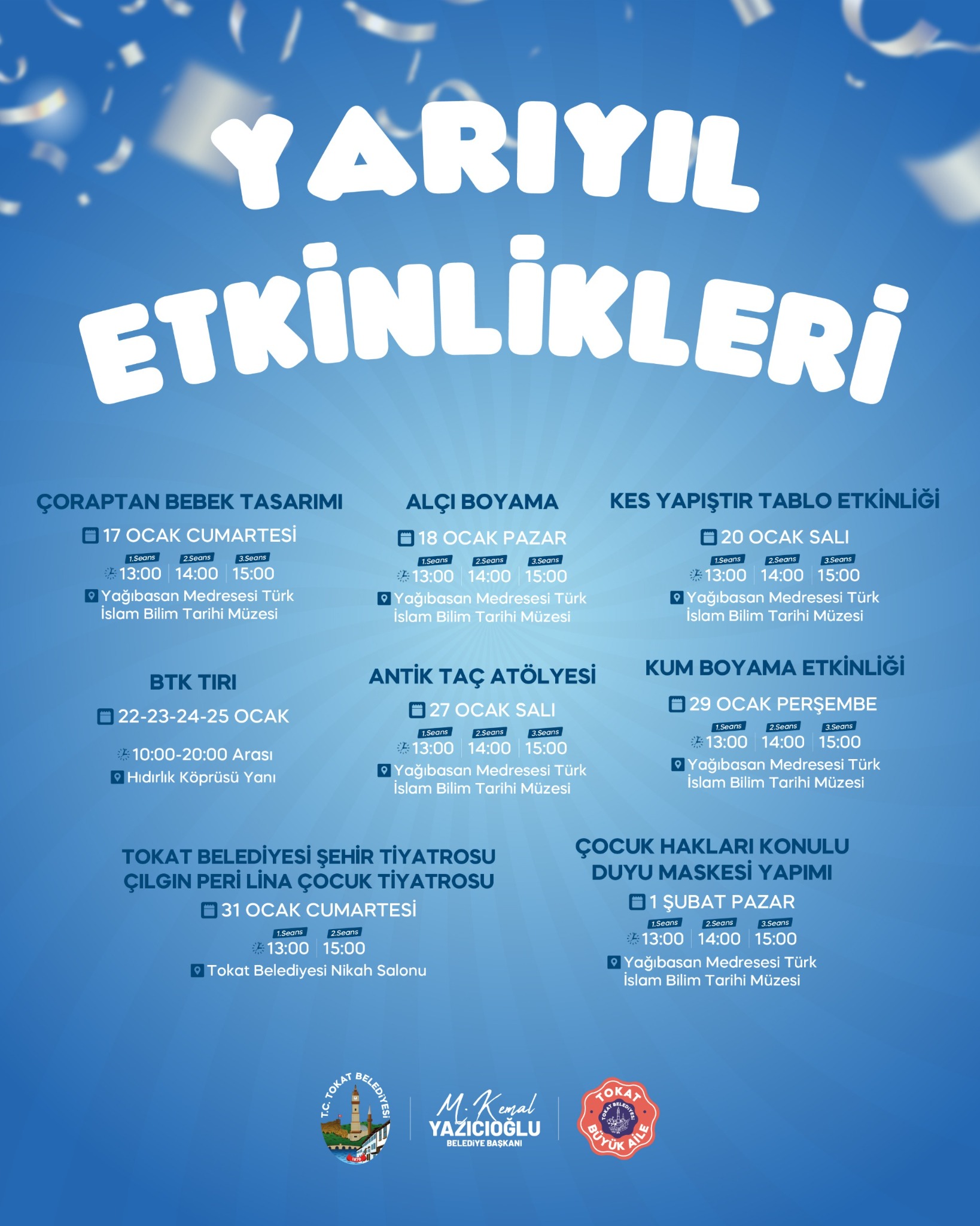 Tokat Belediyesi tarafından organize edilen yarıyıl etkinlikleri, çocukların hem eğlenmesini hem de el becerilerini ve hayal güçlerini geliştirmesini amaçlıyor. Programda sanat, bilim ve kültürel içerikli birçok etkinlik yer alıyor.